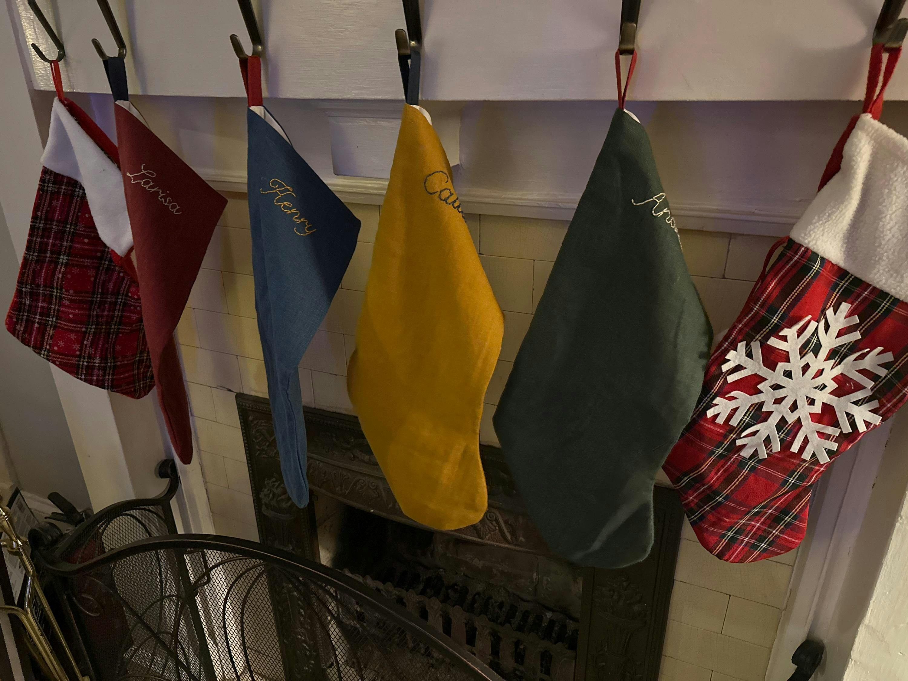 Handmade in Santa Fe, NM, these classic linen Christmas stockings are where the warmth of a Victorian Christmas and Scandinavian simplicity meet on a Venn diagram. They would be at home hanging from a mantel in Stockholm, brightening a cozy cabin in Vermont, or holding little packages in a sunny Los Angeles apartment.