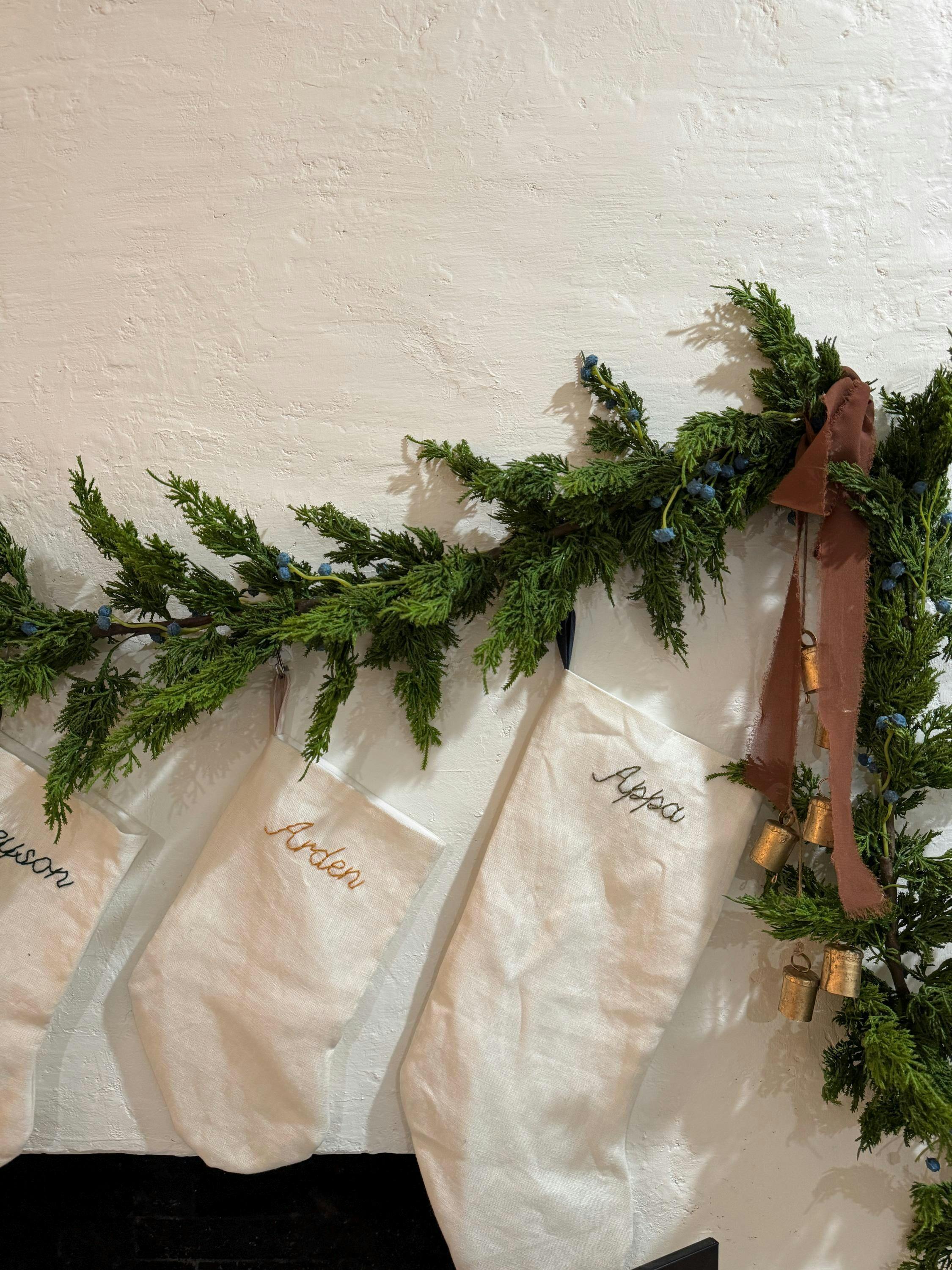 Handmade in Santa Fe, NM, these classic linen Christmas stockings are where the warmth of a Victorian Christmas and Scandinavian simplicity meet on a Venn diagram. They would be at home hanging from a mantel in Stockholm, brightening a cozy cabin in Vermont, or holding little packages in a sunny Los Angeles apartment.